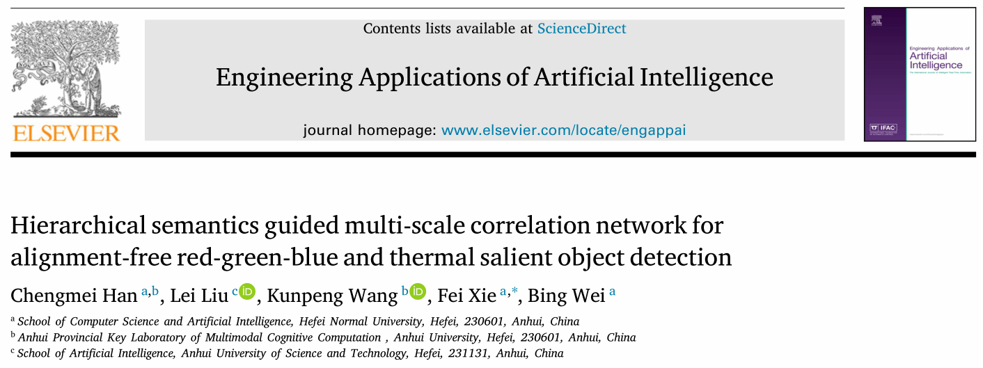 相关成果以题为 “Hierarchical semantics guided multi-scale correlation network for alignment-free red-green-blue and thermal salient object detection”的论文发表在国际知名期刊《Engineering Applications of Artificial Intelligence》上。 该期刊为中国科学院一区TOP期刊。合肥师范学院为该论文第一完成单位,计算机与人工智能学院韩成美老师为第一作者。