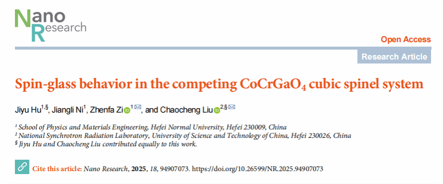 近日,物理与材料工程学院胡吉玉老师,在尖晶石体系CoCrGaO₄中发现了自旋玻璃行为并取得重要研究进展,将该研究成果发表在《Nano Research》(中科院大类一区,IF = 9.0),论文题目为“Spin-glass behavior in the competing CoCrGaO4 cubic spinel system”。胡吉玉老师为本论文的第一作者,合肥师范学院訾振发教授、中国科学技术大学刘超成副研究员为本论文的通讯作者,合肥师范学院-物理与材料工程学院为论文的第一通讯单位。