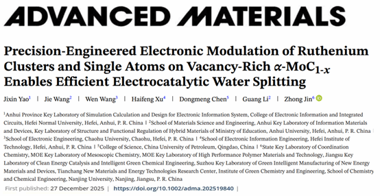 近日,电子信息与集成电路学院青年教师姚吉鑫及其合作团队在精密工程化电子调控核心技术方面取得突破性研究进展,相关研究成果以“Precision-Engineered Electronic Modulation of Ruthenium Clusters and Single Atoms on Vacancy-Rich α-MoC1-x Enables Efficient Electrocatalytic Water Splitting”为题,发表于材料科学顶级期刊《Advanced Materials》(自然指数期刊,中国科学院大类一区Top期刊,IF = 26.8)。电子信息与集成电路学院姚吉鑫博士为第一作者,合肥师范学院为第一署名单位。