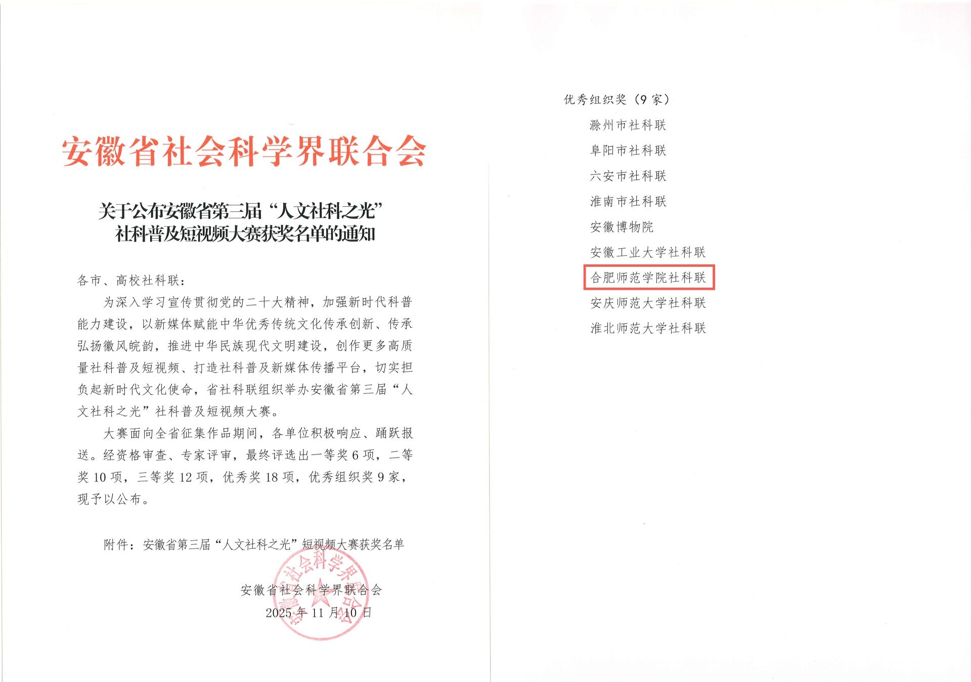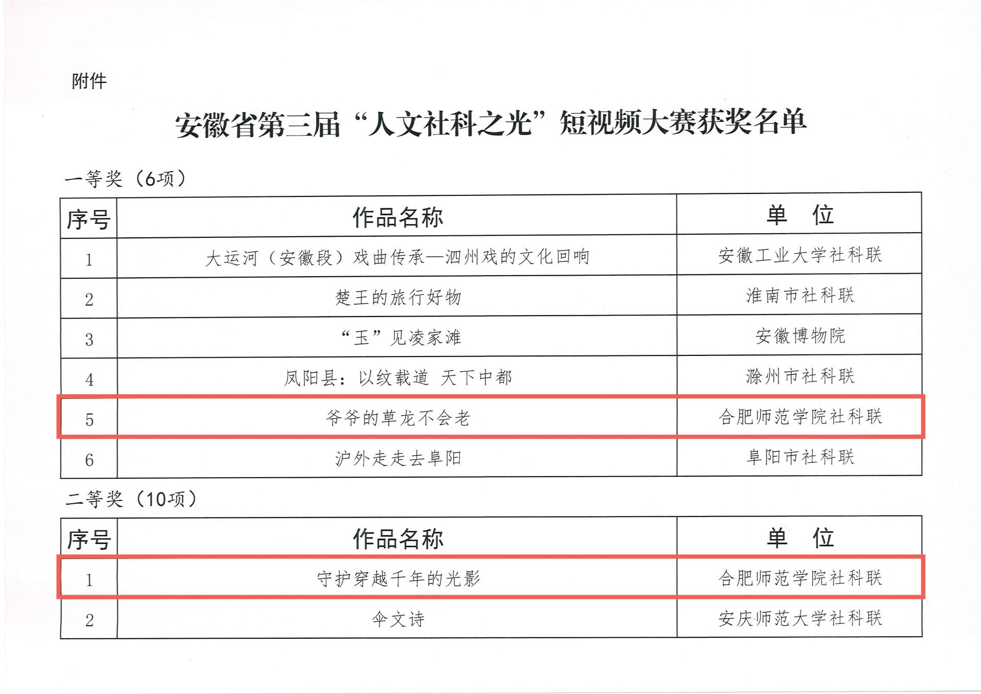 近日,安徽省社会科学界联合会公布了第三届“人文社科之光”社科普及短视频大赛获奖名单。我院社科联推荐的作品《爷爷的草龙不会老》《守护穿越千年的光影》分获大赛一、二等奖,院社科联获优秀组织奖。