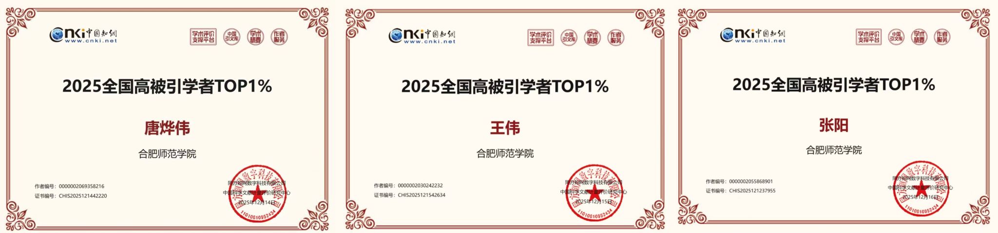 近日,中国知网中国科学文献计量评价研究中心公布了“2025中国知网高被引学者”发布名单,我校唐烨伟、王伟(化学与化学工程学院)、张阳三位教师入选高被引学者Top1%名单。其中,王伟、张阳两位教师继2024年入选“中国知网高被引学者”Top1%名单后,再次入选。另有陈延松、王占军、赵一婷、朱镜人、黄风、游永豪、李哲、谢飞、朱桂兰、刘经涛、谢阳群、吴利等十二位教师入选“2025中国知网高被引学者”Top5%名单。其中,王占军、游永豪、谢阳群、吴利等四位教师继2024年入选“中国知网高被引学者”Top5%名单后,再次入选。学科分布有教育学、体育学、心理学、管理学、食品科学与工程、计算机科学等。