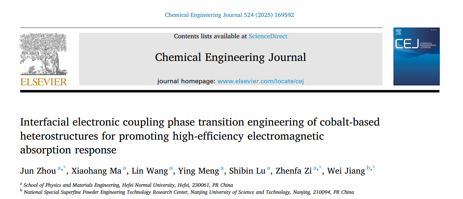 近年来,随着无线通信技术的快速发展以及军事隐身需求的日益增长,电磁波吸收材料的研究不仅关乎国家战略安全,也对民用科技和日常生活产生深远影响。物理与材料工程学院周俊博士、訾振发教授联合南京理工大学在高性能电磁吸收材料领域取得重要进展,相关研究成果以《Interfacial Electronic Coupling Phase Transition Engineering of Cobalt-Based Heterostructures for Promoting High-Efficiency Electromagnetic Absorption Response》为题发表在《Chemical Engineering Journal》期刊(中科院一区Top,IF=13.2)。周俊博士为本论文第一作者,合肥师范学院訾振发教授、南京理工大学姜炜教授为本论文的通讯作者,合肥师范学院为论文第一单位。