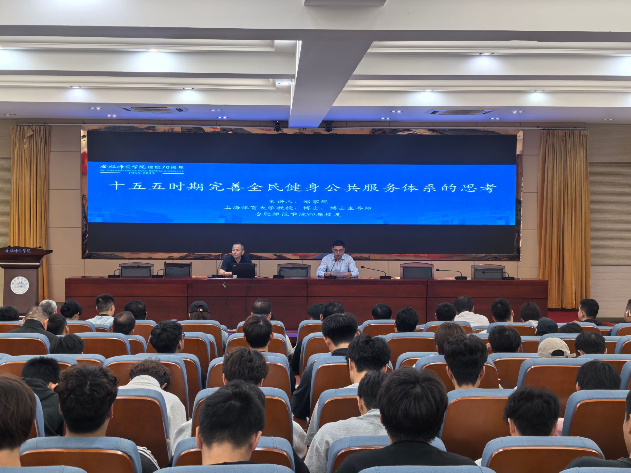 时值合肥师范学院建校70周年,校园内洋溢着喜庆与学术交融的浓厚氛围。9月24日下午,99届杰出校友、上海体育大学教授、博士生导师郑家鲲应邀重返母校,在锦绣校区学术报告厅为体育科学学院师生带来了一场题为“‘十五五’时期完善全民健身公共服务体系的思考” 的精彩学术报告。本次报告不仅是校庆系列学术活动的重要组成部分,也为师生提供了一次与前沿体育政策研究深度对话的宝贵机会。