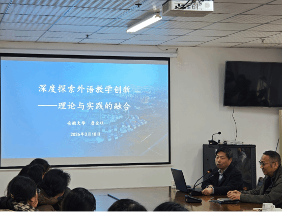 为探索新时代外语学科发展路径,深化外语教学改革创新,有效提升教师教学能力和科研水平,3月18日下午,外国语学院特邀安徽大学外国语学院院长、博士生导师詹全旺教授,举办“深度探究外语教学创新”专题学术讲座,外国语学院院长李可胜、副院长吴礼敬以及硕士生导师、学科教学方向的教师和研究生参加了讲座。